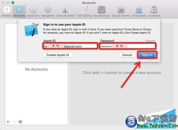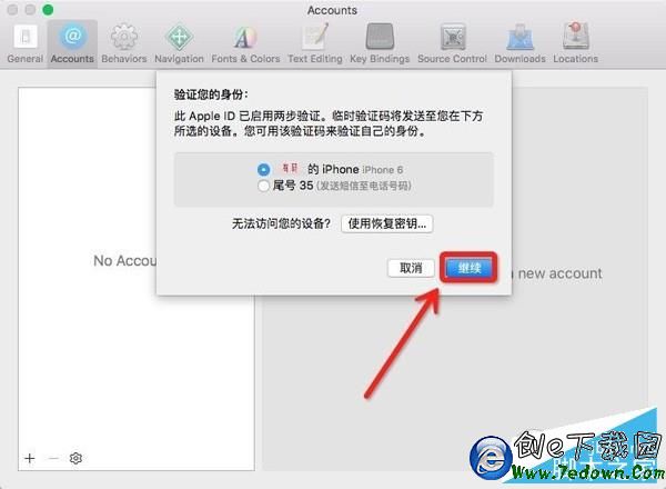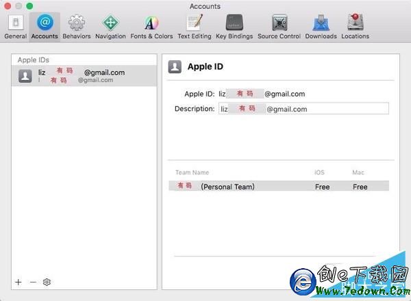 5、修復代碼簽名問題,添加 Apple ID,已經開啟兩步驗證的鋒友需要驗證一下,添加完成後如下圖,關閉 Accounts 窗口,提示 Reset 的,請點擊 Reset,不提示的請忽略此步,至此,代碼簽名問題已修復。
