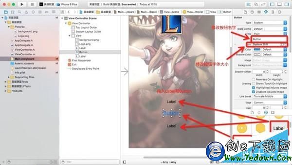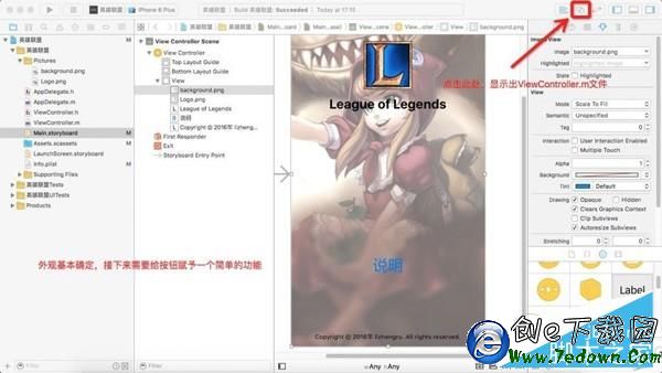 7、修改 View Controller 屬性,添加圖像視圖,拖入 Label 和 Button 控件並適當修改其外觀屬性。