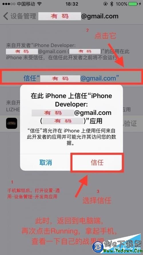 10、此時程序已經安裝在手機裡面了,但是得不到系統的信任,現在要做的就是在 iPhone 手機上解鎖屏幕,前往設置 - 通用 - 設備管理 - 開發商應用,信任你的 Apple ID,然後再次點擊 Xcode 裡的 Running。這樣一來,我們就已經成功的完成了開發一個完整的程序,試著點擊它吧。