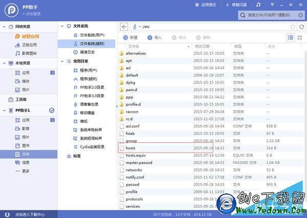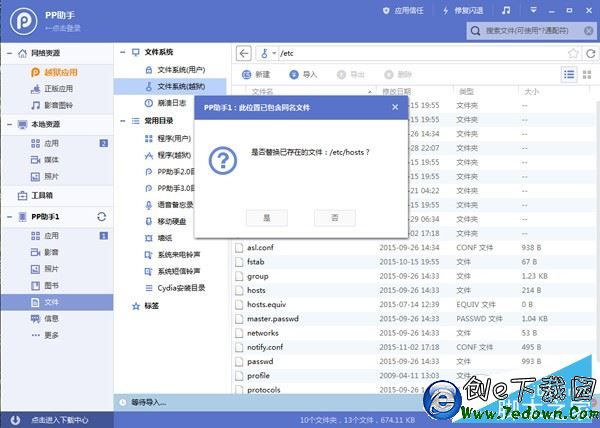 2、設備連接PP助手電腦版,在【文件系統(越獄)】中找到【etc】文件夾,將下載好的host文件導入,選擇替換;