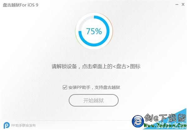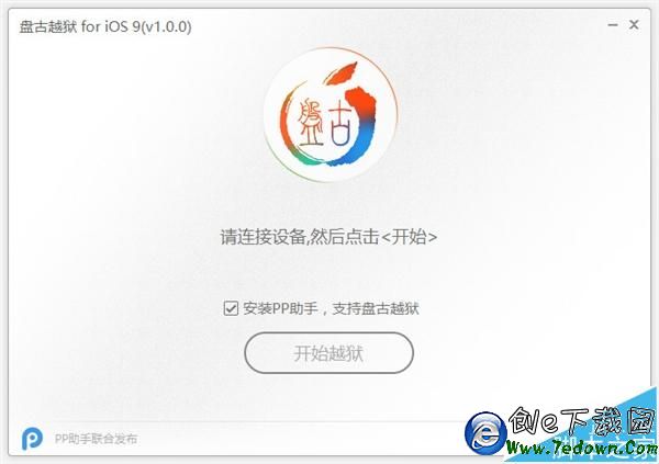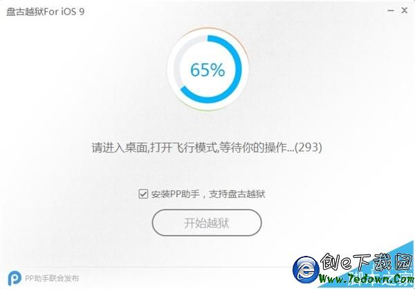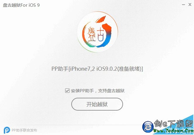 2、點擊開始越獄(盤古與PP助手合作,可以選擇安裝,也可不安裝)。
