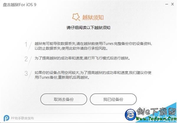 3、閱讀“越獄須知”後,點擊“我已經備份”進入下一步。