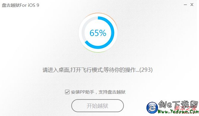 5、PP越獄工具正在為設備進行越獄,當進行至提示“請打開飛行模式”時,請打開蘋果設備的飛行模式,PP越獄工具會繼續越獄
