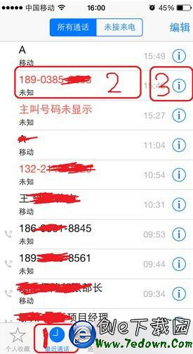 進入“電話”選項後找到“最近通話”選項,然後找到你准備阻止的電話號碼,最後找到紅圈所示數字3標示“i”符號點擊進入。
