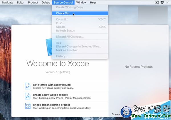 5、在Xcode 7中,單擊上方的“Source Control”菜單項,並選擇其中的“Check Out...”檢查;
