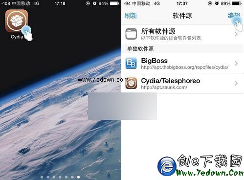 1、進入Cydia—點擊底部“軟件源”—點擊右上角“編輯”