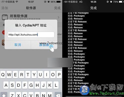 3、再彈窗中輸入3K源地址:apt.3kzhushou.com—點擊“添加源”—等待安裝—點擊“回到Cydia”