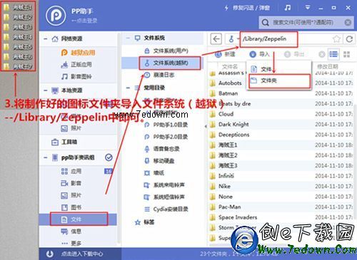 3.通過Zepplin也可將用戶自己制作的圖標替換運營商文字,前提是要先DIY出PNG格式圖案(150*40像素)並放入相關文件夾。以制作好的海賊王圖標來示范,打開PP助手將該文件夾導入文件系統(越獄)--/Library/Zeppelin中即可。