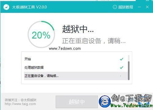 6、如下圖所示,在越獄到20%的時候,此時設備會被強制重啟,屏幕上會出現白蘋果標志,不用理會,繼續等待越獄工具進行越獄。