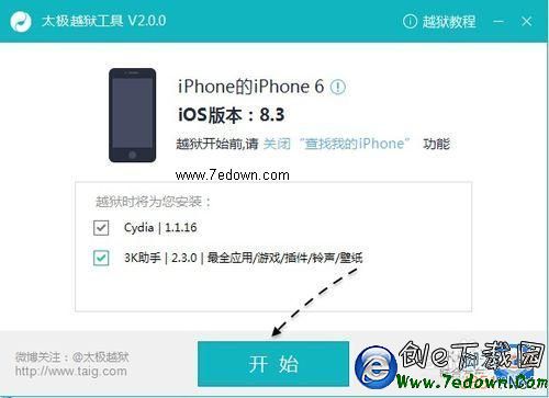 5、當下載完成以後,會自動運行太極越獄助手,如圖所示。此時如果你的 iPhone、iPad 或 iPod Touch 打開了 iCloud 中的“查找我的iPhone”選項,請先關閉它。准備好以後,請點擊“開始”按鈕,開始越獄之旅。