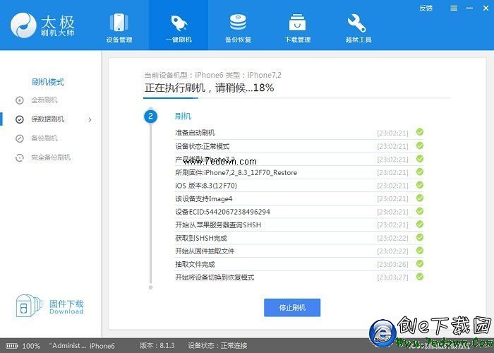 2、太極刷機大師會根據您接入的設備匹配相應的固件,選擇好固件版本和刷機模式後,點擊立即刷機;程序會自動下載固件,當固件下載完畢後,會自動開始刷機。在這裡小編就用已經下載好的固件繼續下去了。