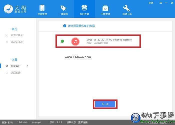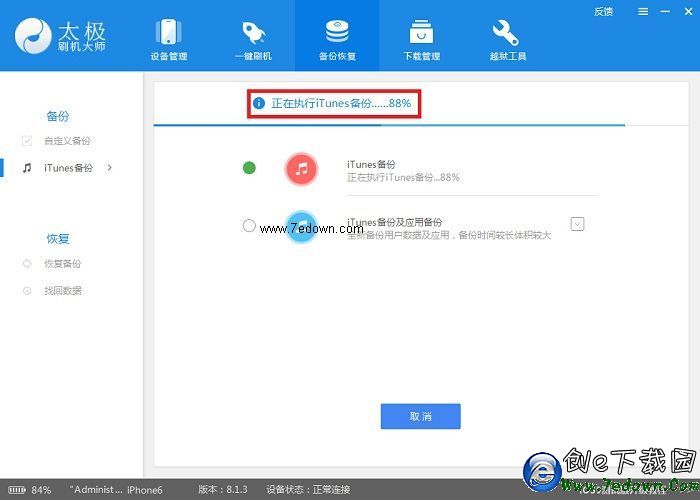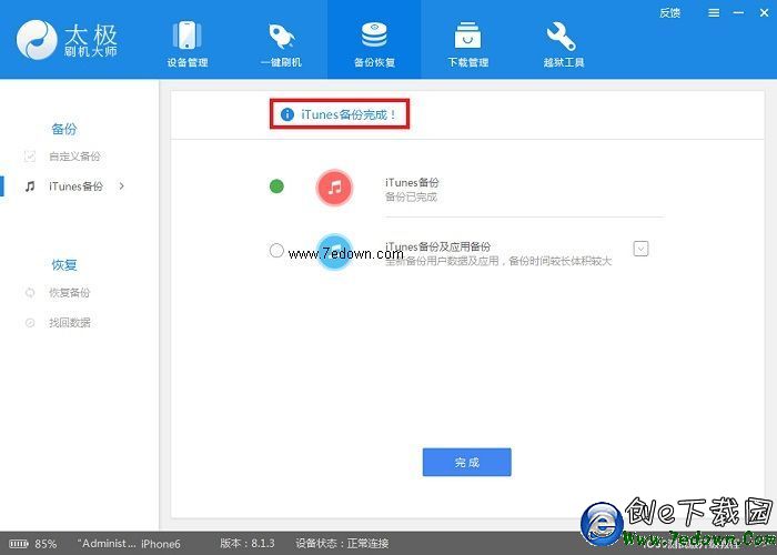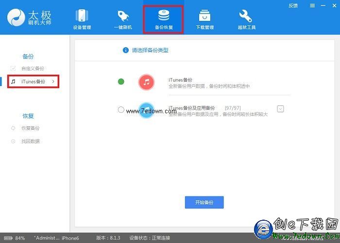 操作流程:1、將手機連接電腦,打開太極刷機大師,選擇【備份恢復】->【iTunes備份】