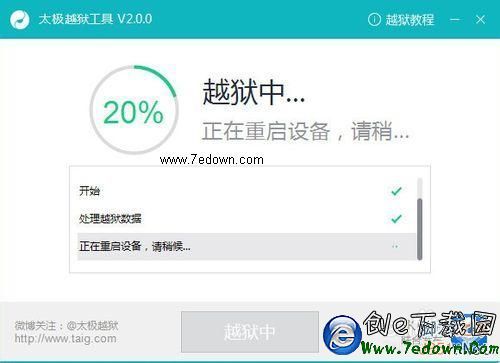 1、如下圖所示,當使用太極越獄工具時,會遇到一直卡在20%的階段,並且最後出現越獄失敗的結果。