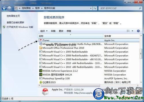 4、接下來請在系統中打開控制面板,在卸載程序窗口列表中,找到 iTunes 一欄,先把它卸載了。當卸載完成以後,重新啟動一次電腦系統。