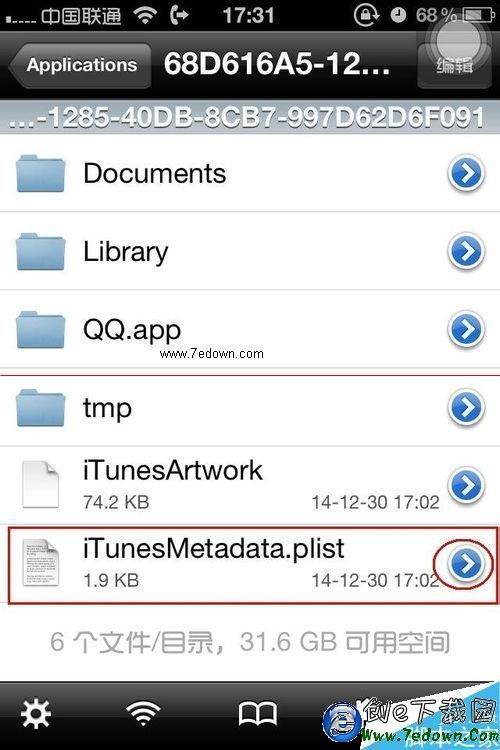 3、QQ文件夾下面會看到iTunesMetadata.plist,按右側的">"。