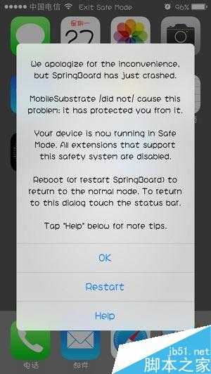 iOS8用戶如果發現設備界面變成灰色,狀態欄上顯示“Exit Safe Mode”,並彈窗提示“We apologize for the inconvenience,but SpringBoard has just crashed. MobileSubstrate did not cause this problem:it has protected you from it.”那麼“恭喜你”,你的設備已經進入安全模式。