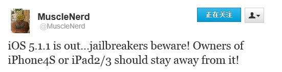 新一輪固件更新總會伴隨新一輪的越獄動向。人人都在翹首期盼Pod 2g大神盡快放出iOS 5.1完美越獄之際,蘋果做出了一個“引誘”的行動,於今日放出了iOS 5.1.1。這個最新固件的可越獄性如何?肌肉男剛剛通過Twitter發話了:iPhone 4S/iPad 2/3用戶需要遠離本次更新。