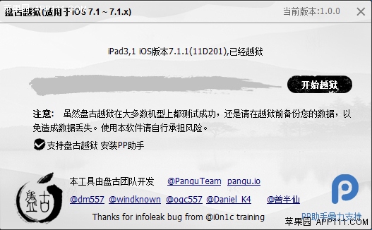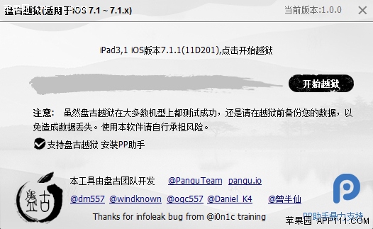 6、越獄完成【盤古】提示:越獄成功。注:新版已經內置afc2補丁,不用再自行安裝。