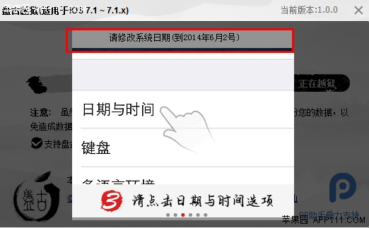 2、點擊程序主界面的(開始越獄)按鈕,【請注意:如果不想安裝PP助手,請將安裝PP助手選項勾去掉】然後將設備的系統時間改為6月2日,這點和以往的越獄步驟不同(不知道為什麼要這麼操作),越獄成功後系統時間自動恢復正常時間。