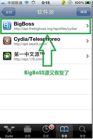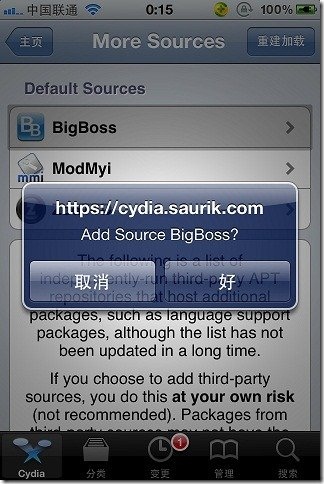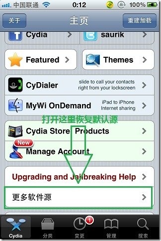 看以上步驟 ,如果我們誤刪除了Cydia自帶的源的話,是推薦這樣重新安裝的。當然你也可以手動到軟件源中去根據地址添加,當然這就沒有以上這個辦法方便。