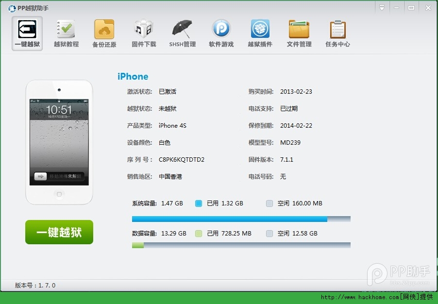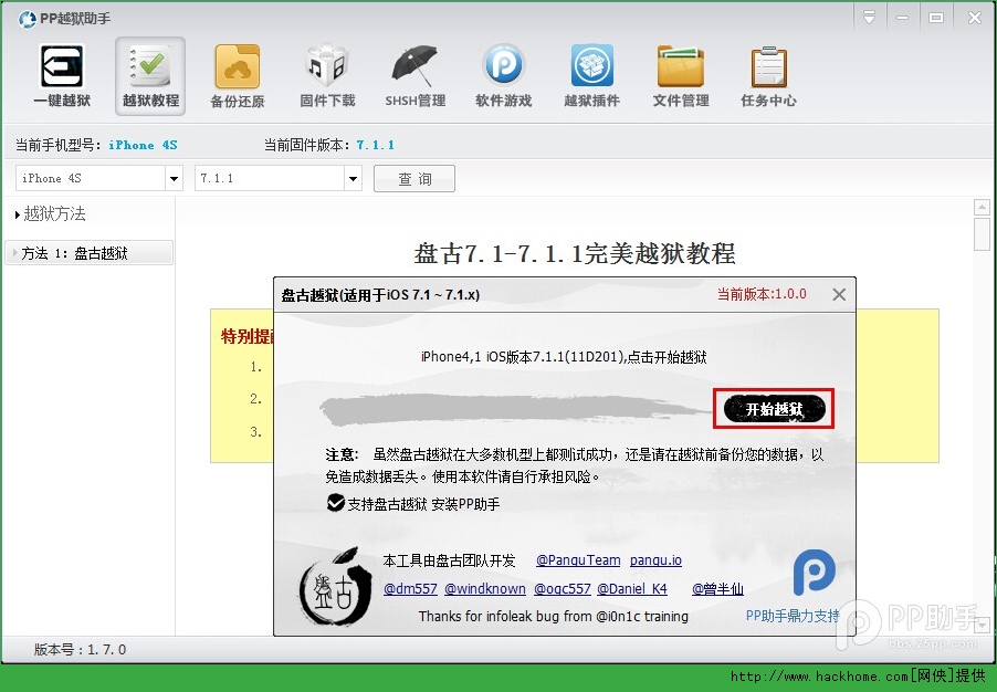 第二步:PP越獄助手自動識別設備機型與固件版本彈出越獄工具:【盤古】