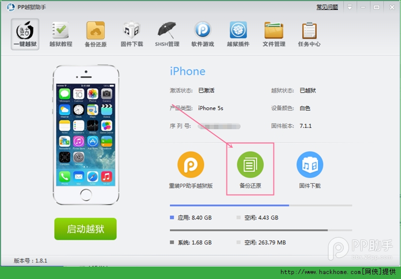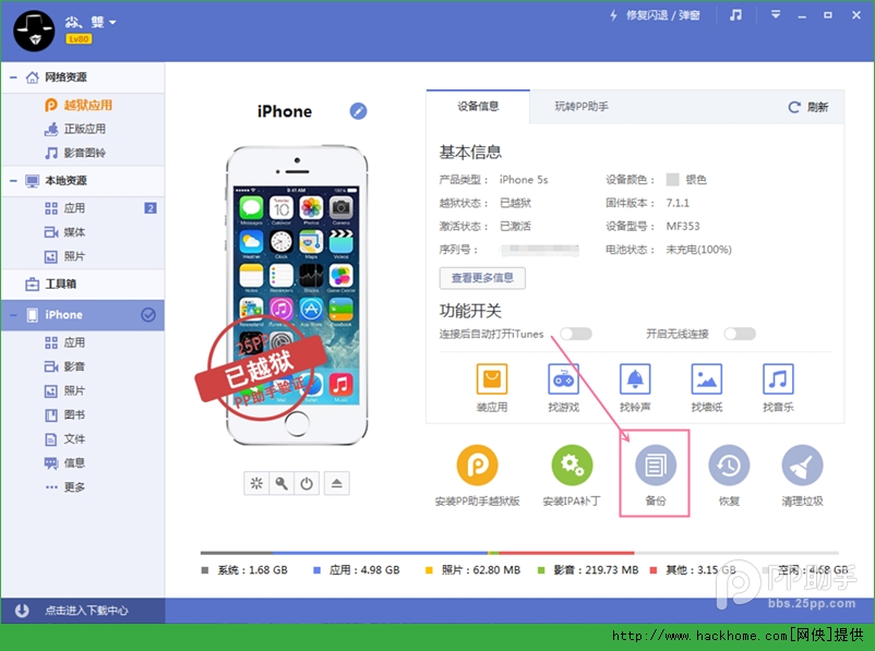 1.將設備連接至PP越獄助手,點擊“備份還原”