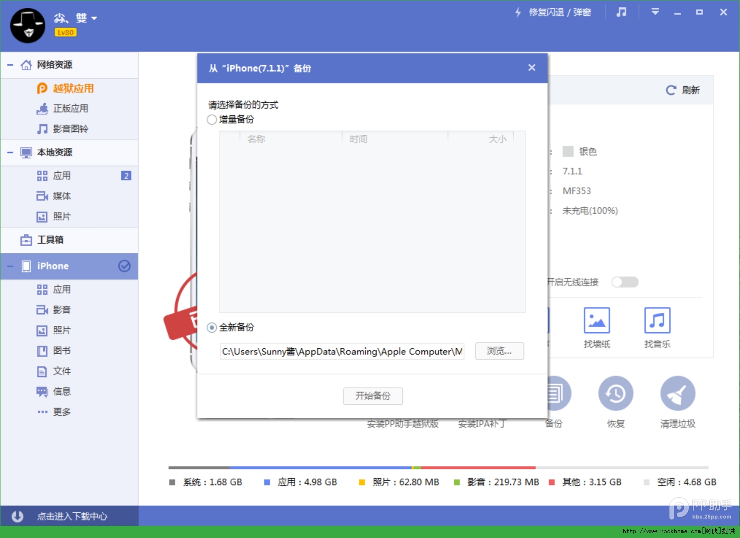 使用PP助手備份應用程序請預留iOS設備上有足夠的空間備份,因為PP助手備份應用程序時將應用程序一個一個在iOS設備上進行打包壓縮完成後再保存到本地電腦上(操作好會自動刪除設備上壓縮文件進行下一程序打包壓縮),所以請確保手機剩余空間是足夠打包應用程序的大小。