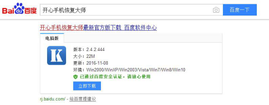 第二步、恢復誤刪的短信之前,還需要將“開心手機恢復大師”下載到電腦上,下載方式不限,直接百度“開心手機恢復大師”點擊“立即下載”即可;