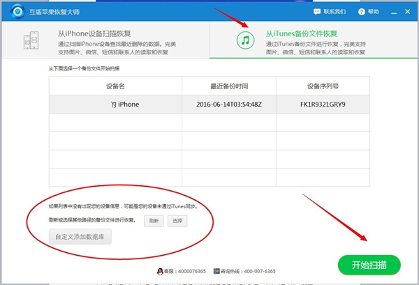 步驟1。下載安裝好互盾後,請點擊“立即運行”按鈕進入軟件操作界面,然後點選“從iTunes備份文件恢復”功能模式,軟件界面中將會自動出現iTunes備份的文件,如果沒有出現,請點擊軟件下方的“選擇”/“自定義數據庫”功能鍵,在彈出的窗口添加備份數據,然後掃描。掃描後,就可以看見我們丟失的數據了,這裡包含了蘋果手機中的所有數據。