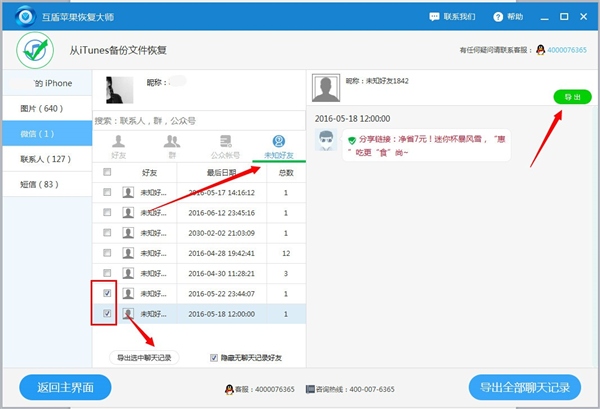 步驟2。要導出微信聊天記錄,請點選微信,在微信界面選擇需要導出的聊天記錄,比如選擇“未知好友”,在好友列表中勾選需導出微信聊天記錄的好友賬號,點擊“導出選中聊天記錄”/“導出”功能鍵導出微信聊天記錄即可。