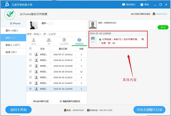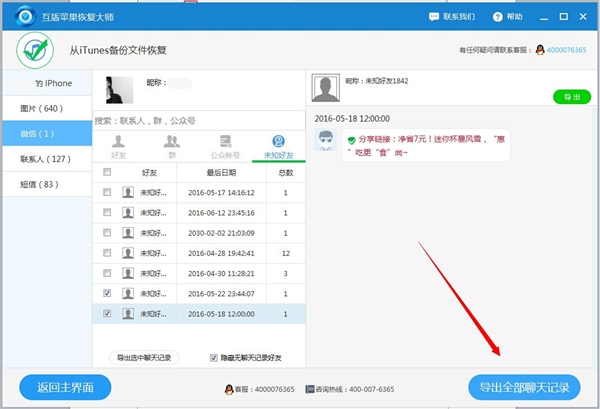 可導出微信內容。互盾蘋果恢復大師可以查看導出微信的語音、文字和圖片等所有類型的記錄,如果要導出全部也可以選擇“導出全部記錄”。