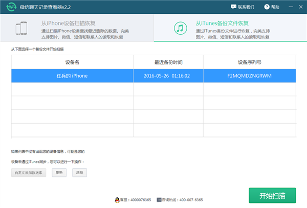 3.上面的步驟操作完成以後我們將上面安裝好的微信聊天記錄查看器打開,正常情況下軟件會自動跳轉到如下界面。我們可以看到手機的設備名、最近備份的時間以及設備的序列號。當然還可以自定義添加數據庫來進行查看也是可以的。不過這邊既然都識別到了設備我們就可以直接點擊開始掃描按鈕即可。