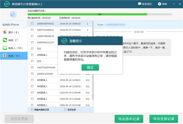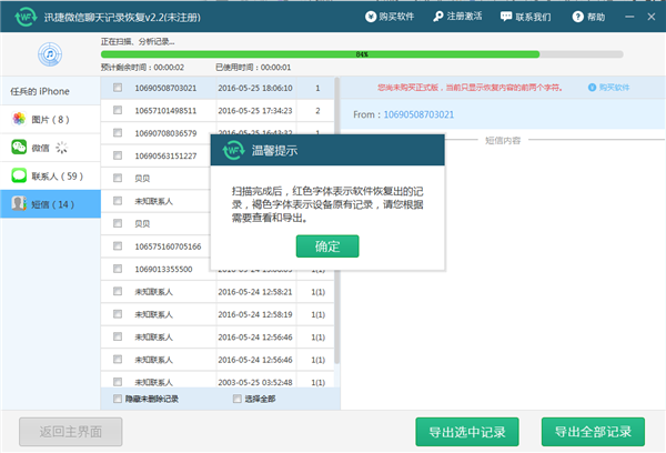 4.軟件掃描完成以後會有一個溫馨的提示,如果你熟悉此刻迅捷微信聊天記錄查看器的話就可以忽略了。不熟悉的可以仔細看下。紅色字體表示軟件查看的記錄,,褐色字體表示設備原有的記錄。這邊可以根據自己的要求進行查看和查看。