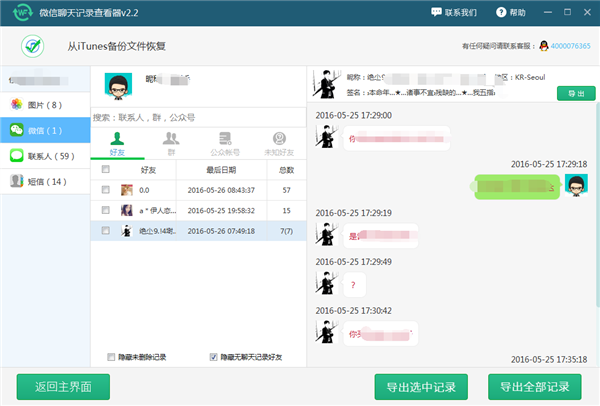 6:經過軟件預覽以後我們可以看到需要查看的微信聊天記錄,這邊我們可以在需要查看的人前面打勾。同時點擊下方的導出選中記錄即可對該聯系人的聊天記錄進行導出。如果要查看所有聯系人的聊天記錄我們就點擊導出全部記錄即可。