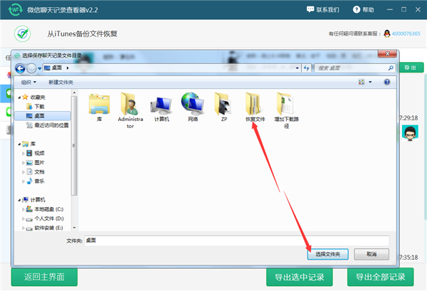 8:然後我們可以在電腦桌面新建一個文件夾用於保存即將查看的聊天記錄,然後點擊選擇文件夾即可。