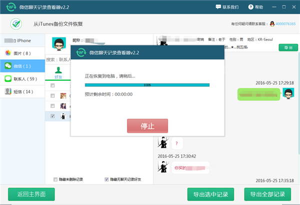 3:然後軟件會對整個手機進行全方位掃描,包括手機圖片,手機微信聊天記錄、手機聯系人(通訊錄)及手機短信等。掃描的過程中我們最好不要終止它,等它自動掃描完成即可。這樣有助於聊天記錄在查看的時候保持完整性。
