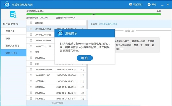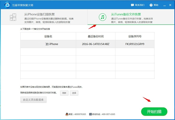 然後把手機和電腦進行鏈接,iTunes軟件會自動將手機中的數據備份到電腦中,然後打開互盾蘋果恢復大師,選擇從iTunes備份文件恢復,只要數據沒有被覆蓋,iTunes就會把所有數據備份到電腦,雖然我們看不見,但是可以用軟件將數據掃描出來。
