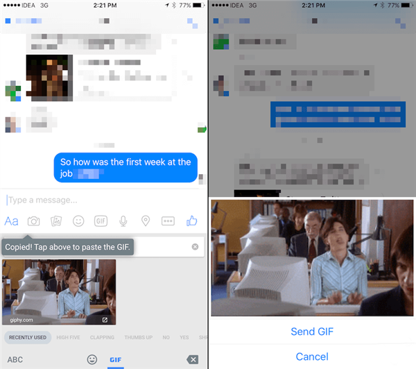 我們可以點擊 Emoji 圖標,選擇“GIF”選項卡,並搜索自己想要發送的 GIF 圖片。點擊該圖片之後,Gboard 就會將它復制到剪貼板。我們要做的就是到文字輸入區域粘貼,並發送。