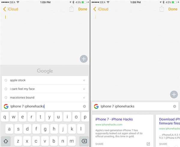 除了 Emoji 表情和 GIF 搜索之外,谷歌搜索欄本身就能給用戶提供非常多的方便。當我們輸入搜索內容並點擊“搜索”按鈕時,鍵盤就會被搜索結果覆蓋,點擊某個搜索結果則可以將網站標題和鏈接插入到文本中。