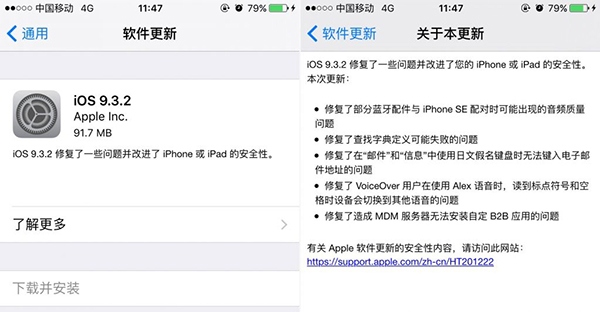 正常來說,現在只要在“設置→通用”裡,點擊”軟件更新“,現在應該可以收到 iOS 9.3.2 的軟件更新提示了。如果你之前已經升級到了 iOS 9.3.1,那麼 iOS 9.3.2 是一個相對較小的更新,上面的描述也寫得很清楚,主要“修復了一些問題並改進了 iPhone 或 iPad 的安全性”。不過,如果你是從 iOS 9.2.1 或更早的版本,那麼此次更新應該算得上是一次大更新。