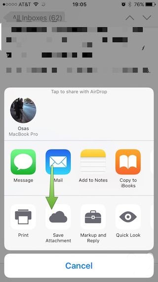 5. 長按附件下載框,直到彈出分享窗口,並選擇“存儲附件”。
