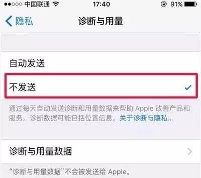 手機每天會通過自動發送診斷和用量數據來幫助Apple改善產品和服務,然而該功能會收集你手機上所有由於崩潰產生的日志文件,也包含地理位置等信息。這個功能在我們日常使用中並沒有什麼卵用,還浪費流量。So,進入“設置”--“隱私”--“診斷與用量”,關掉它!