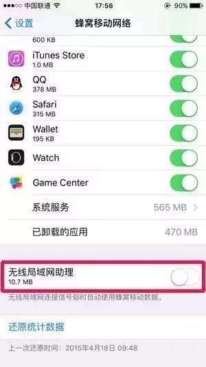 iOS 9新增的Wi-Fi助理功能,當Wi-Fi不穩定的時候,會自動切換到移動網絡,這也讓很多寶寶不知不覺耗費了大量流量。建議進入“設置”--“蜂窩移動網絡”拉到最後,關閉“無線局域網助理”。