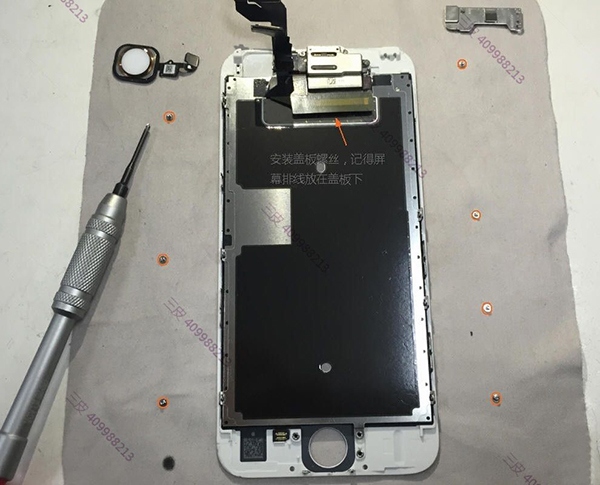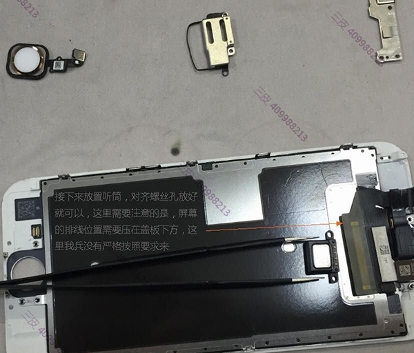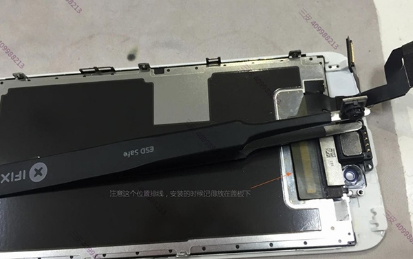 放置聽筒,對齊螺絲孔放好即可。需要注意的是,屏幕的排線位置需要壓在蓋板下方。