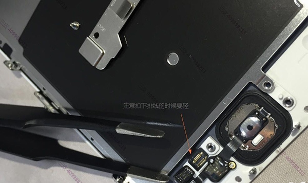 iPhone 6s 的開機排線是和音量鍵整合在一起的,所以安裝排線之前要把靜音鍵裝到排線上,要注意方向。