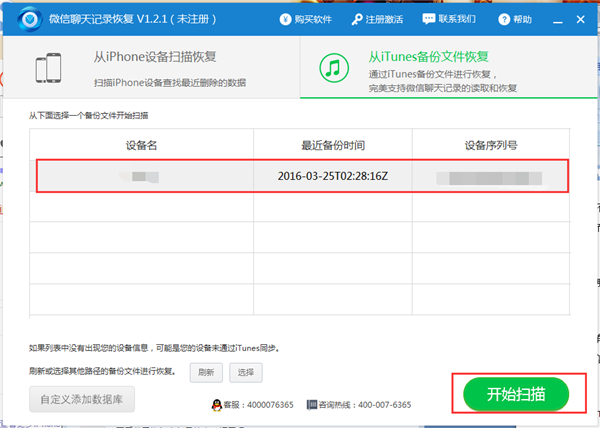 二、iTunes軟件已經備份過手機數據的話,互盾蘋果恢復大師會自動檢測出iTunes備份文件,選擇設備名後,點擊“開始掃描”即可。