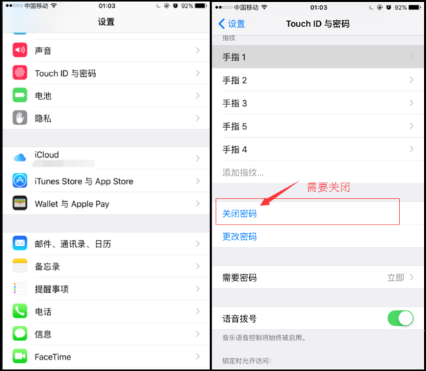 第四步,在設備”設置”—“iCloud”—關閉“查找我的 iPhone ”,然後繼續操作設備”設置”— ” Touch ID 與密碼”—“關閉密碼”。