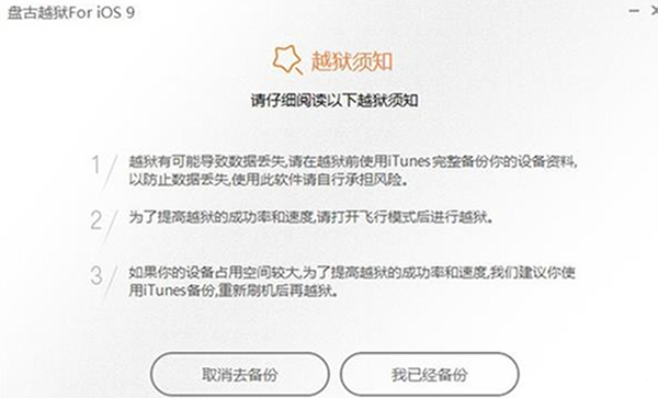 請先備份數據,雖然盤古越獄(iOS9)在大多數機型上都測試成功,還是希望您在越獄前備份您的數據以免造成數據丟失。
