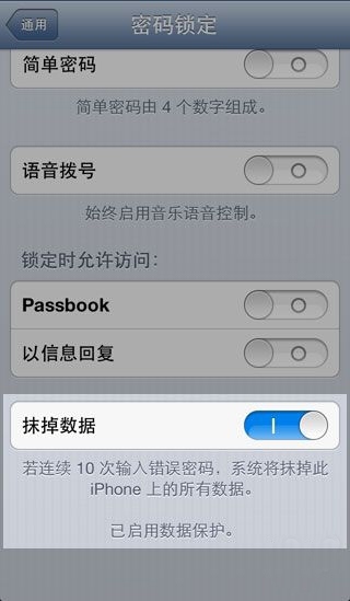 原來是iOS的這個功能,讓FBI不敢輕舉妄動。那麼作為普通用戶,筆者現在想問的一個小問題是——更簡單——我 TM 怎麼把這個默認是關閉的“抹掉數據”這個功能打開?