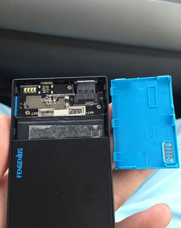將移動電源拆開,其外殼是用卡扣固定的,沒有螺絲,手感略顯單薄。